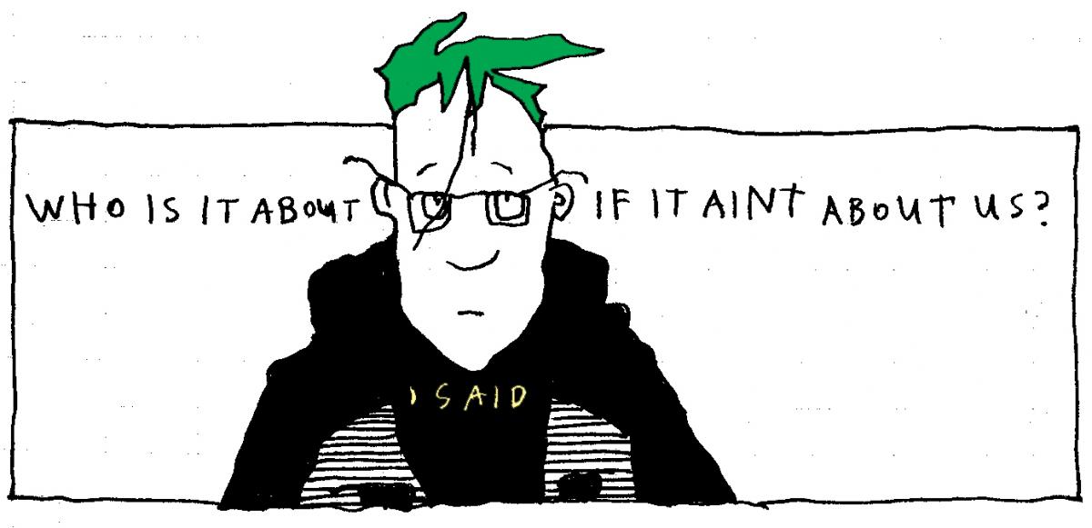 The hand-drawn illustrations, over two hundred of them, emphasize Dawn's strong, memorable voice, and give us a picture of what she looks like, or at least how she views herself—her big messy hair that later turns into a mowhawk, her glasses, and exaggerated chin. Trampoline isn't a traditional graphic novel; the drawings slip in and out of the narrative prose. The comic panels typically depict Dawn speaking; they add intimacy and emphasis to her voice, and give readers another way to hear her. As the illustrations let readers get a look at Dawn, she looks back at the reader, redirecting the gaze.