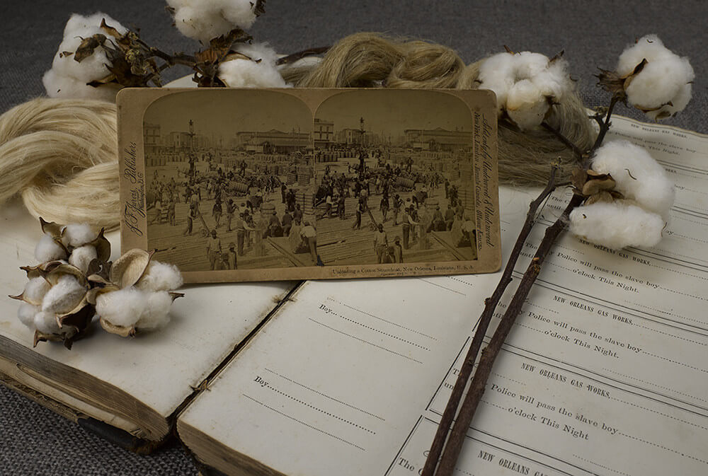 The staged image includes a passbook from the New Orleans Gas Works Company dating to ca. 1860.2This passbook is housed in the African American Miscellaneous Collection in Emory University’s Stuart A. Rose Manuscript, Archives, and Rare Book Library.Passbooks were used during the nineteenth century to track and account for the whereabouts of enslaved African Americans traveling without their owners. The image also includes a nineteenth-century form of photography called the stereograph, known for its illusory 3D effect. Titled "Unloading a Cotton Steamboat, New Orleans, Louisiana, U.S.A." (ca. 1890), the stereograph portrays several black men serving as stevedores on the New Orleans docks.3This stereograph is housed in the Robert Langmuir African American Photograph Collection in Emory University’s Stuart A. Rose Manuscript, Archives, and Rare Book Library.In addition to these archival materials, Dr. Pellom McDaniels III describes the importance of including pieces of hemp and cotton to represent the materials that slaves cultivated and produced: