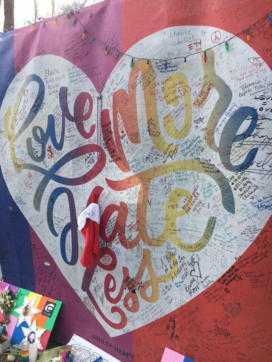 Love More, Hate Less, Pulse memorial site, Orlando, Florida, December 29, 2016. Photograph by Eric Solomon. Courtesy of Eric Solomon.